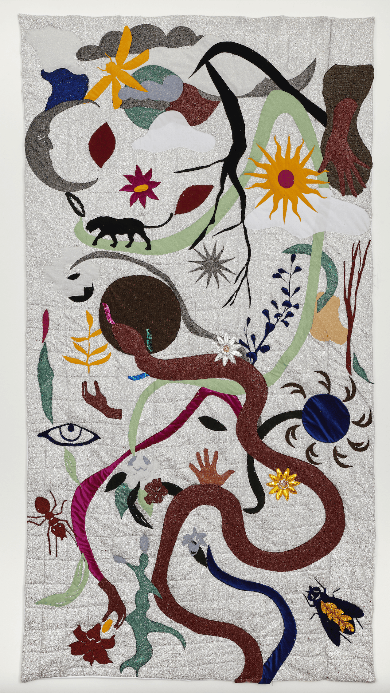 Hand-embroidered leather glove, plastic, glass and metal gems, acrylic paint, thread