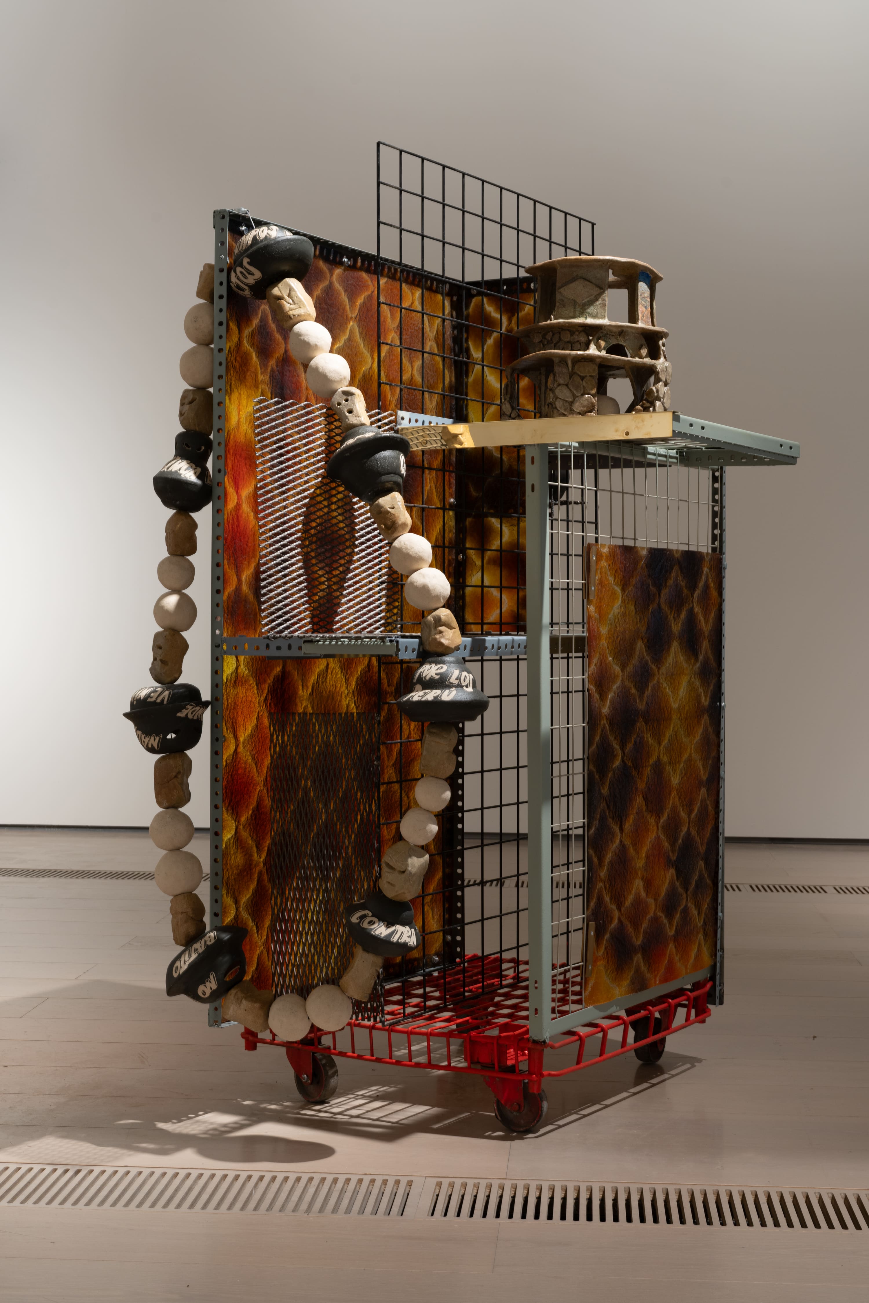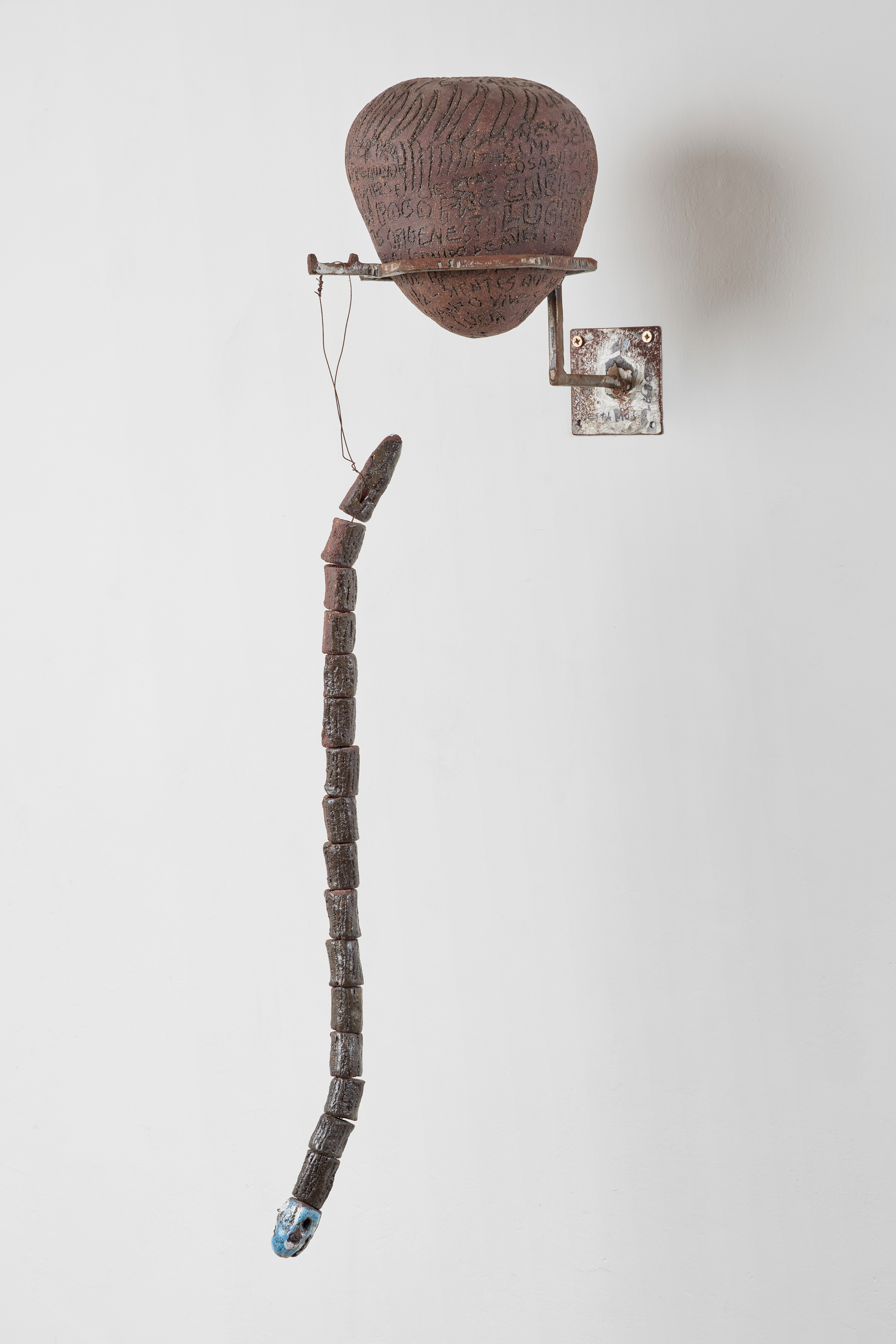 Woodfired stoneware, metal wire, leather belts, microphones and sound system