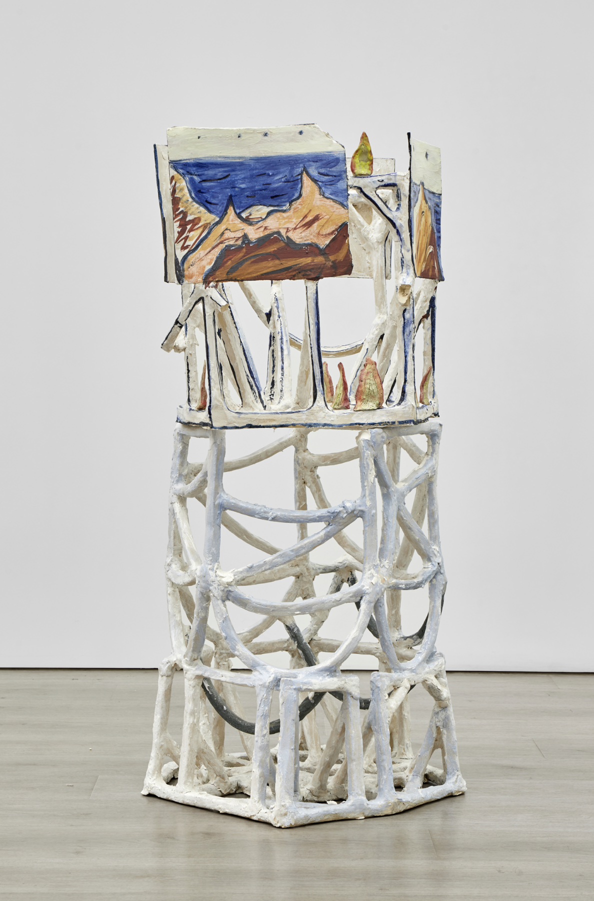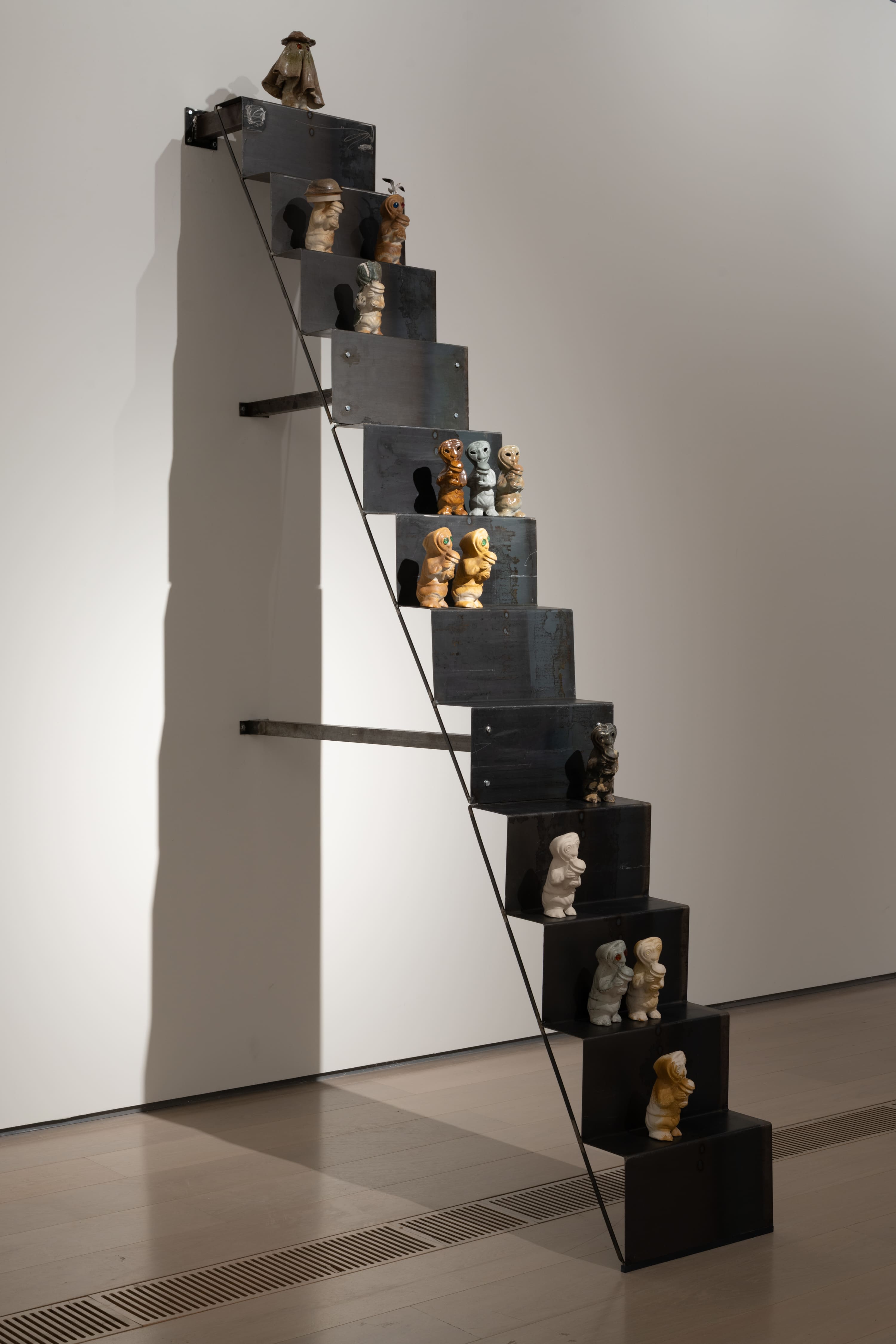Iron, brass, water-based paint, polyester resin, and ceramic