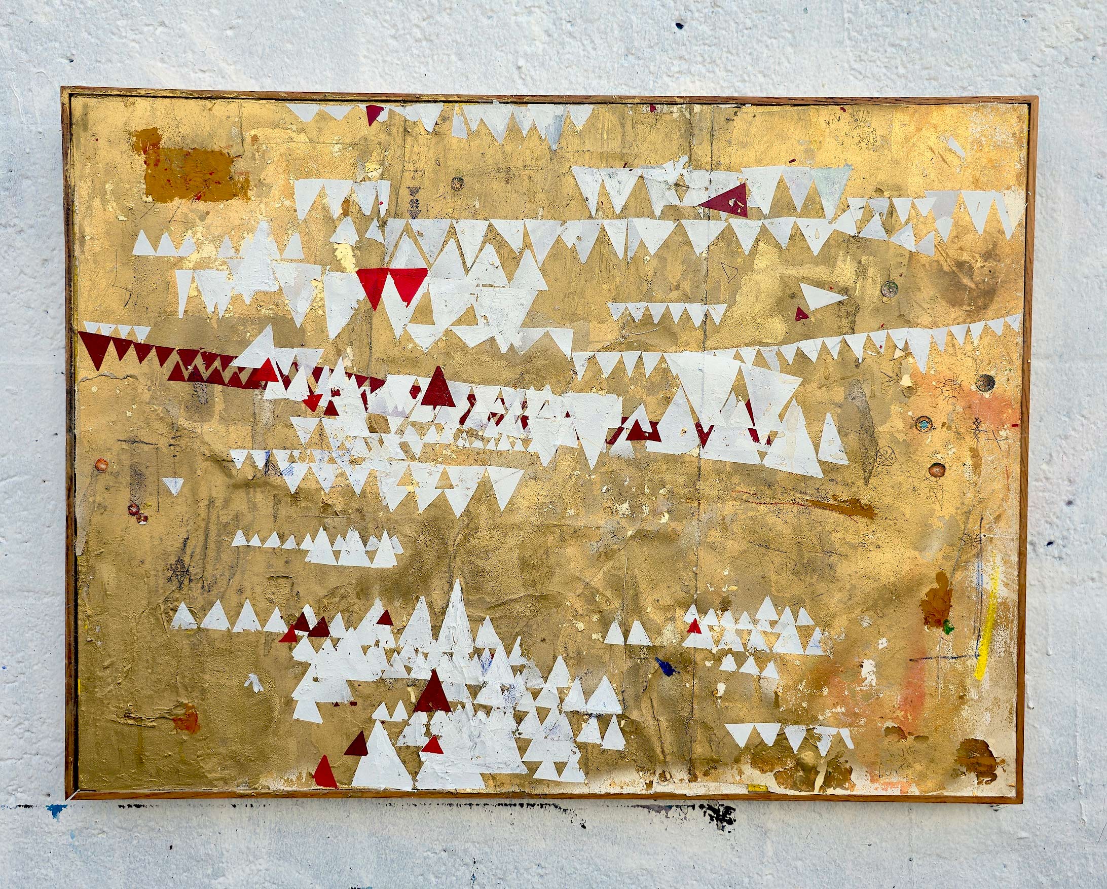 Paint samples, glue, oil painting, graffiti on cardboard, customized frame