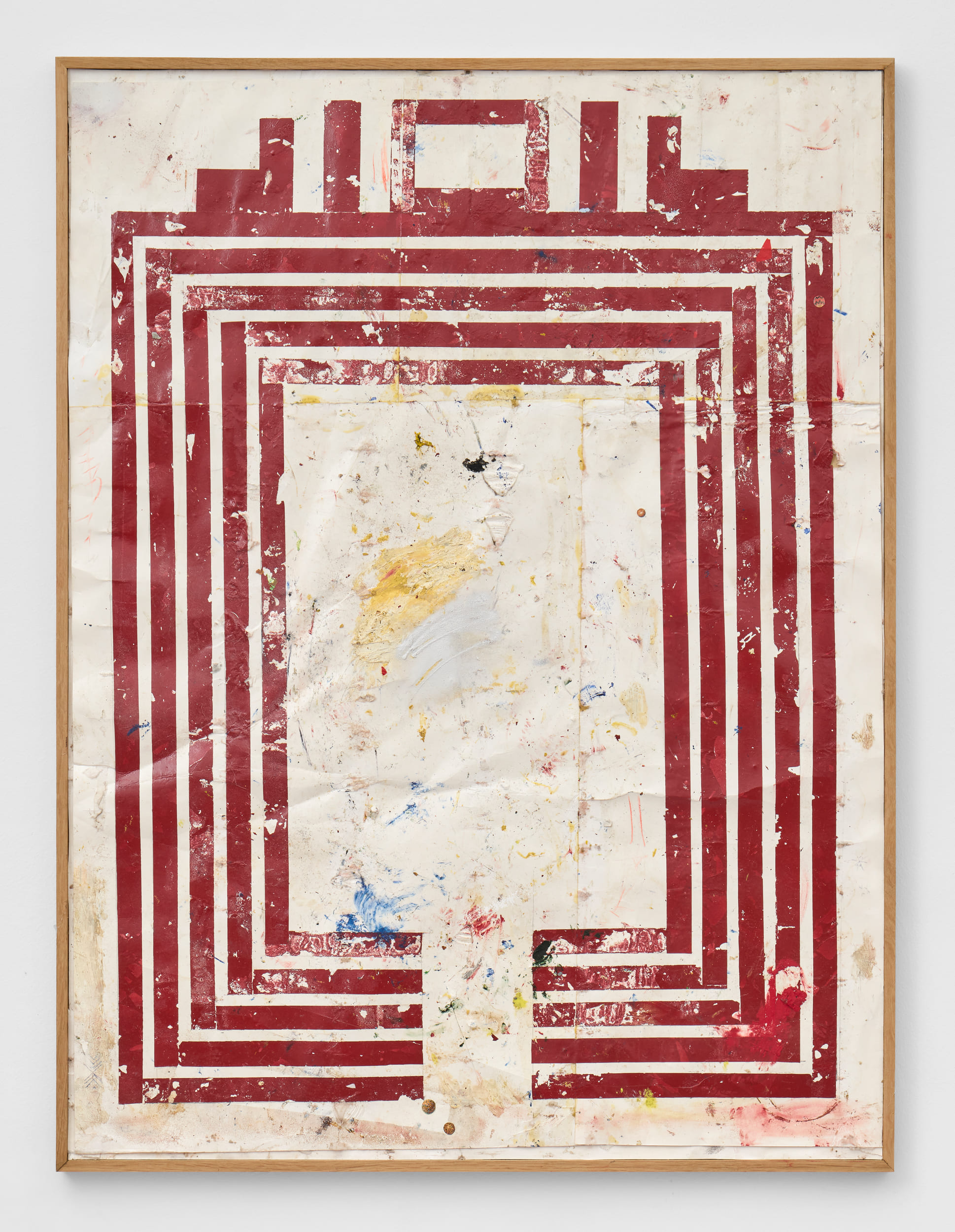 Oil, enamel, graphite, carbon paper transfer, collage on paper mounted on custom wooden frame