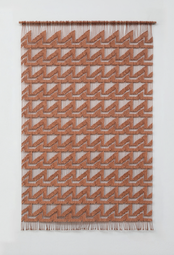 In her Modulations series, Garrido-Lecca explores the role of copper in Peru’s economy, where it is exported as a raw material for technology industries. The works incorporate abstract symbols inspired by modernist corporate logos, woven in traditional forms, questioning the relationship between these modern images—linked to modernization and the global economy—and pre-Columbian abstraction.